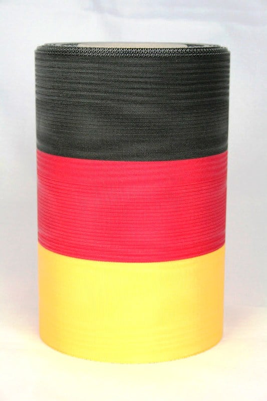Deutschlandband ‘schwarz-rot-gelb’ finden Sie in unserem Shop ab 15 mm Breite bis hin zu 225 mm. Für kleine und große Dekos.